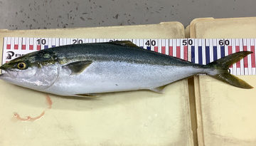 【かもめ大橋周辺】と【大浜周辺】でアジのノマセ釣りでメジロ70cm前後1人1、2尾。同所ではタチウオ70cm前後もポロポロ釣れており、よい人3、4尾。ドジョウのテンヤ釣りとキビナゴの引き釣りで。