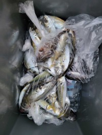 アジ12~17cm250尾、サッパ13~15cm200尾、カタクチイワシ8~10cm120尾、サヨリ16~22cm60尾、サバ20~25cm10尾、チヌ35~40cm3尾、スズキ71cmと70cm、エソ2尾。