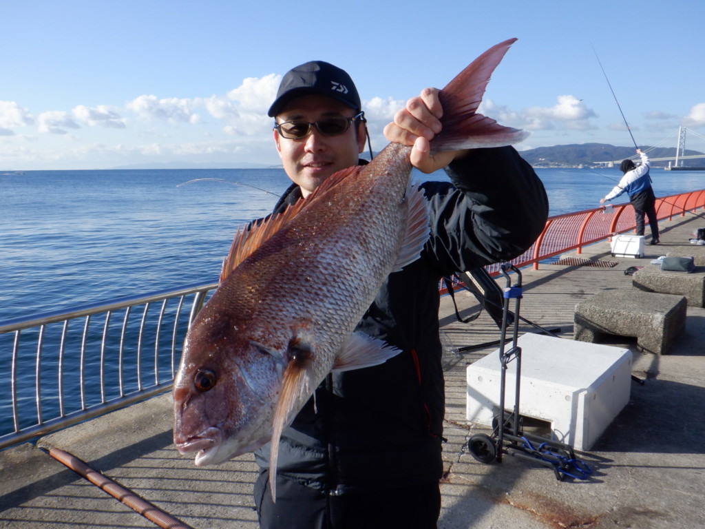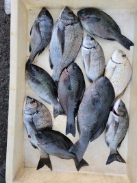 マダイ37cm頭に5尾、小ダイ多数、チヌ45cmと43cm、ヒラメ52cm、カレイ32cm2尾、メバル23cm、アオリイカ、アジなど。