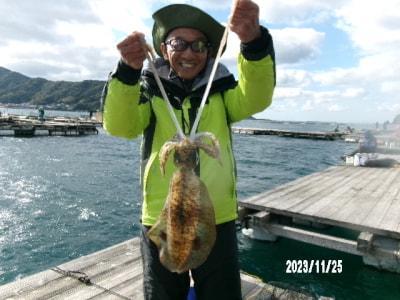 チヌ33cm、ハマチ44.5cm、ヒラメ44cm、アオリイカ1kg頭に9ハイ、サンバソウ1尾、グレ30.5cm頭に10尾、カワハギ25cm頭に5尾、ガシラ8尾、小アジ、ヘダイなど。