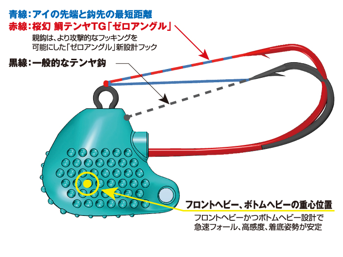 TG(タングステン)製で、比重が高く、より小さいシルエットで速くタナまで沈ませることができる「桜幻 鯛テンヤTG」。