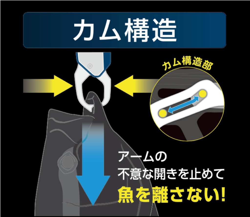 次に、カム構造で不意に開くことを防いでいるので、魚が暴れても安心です。