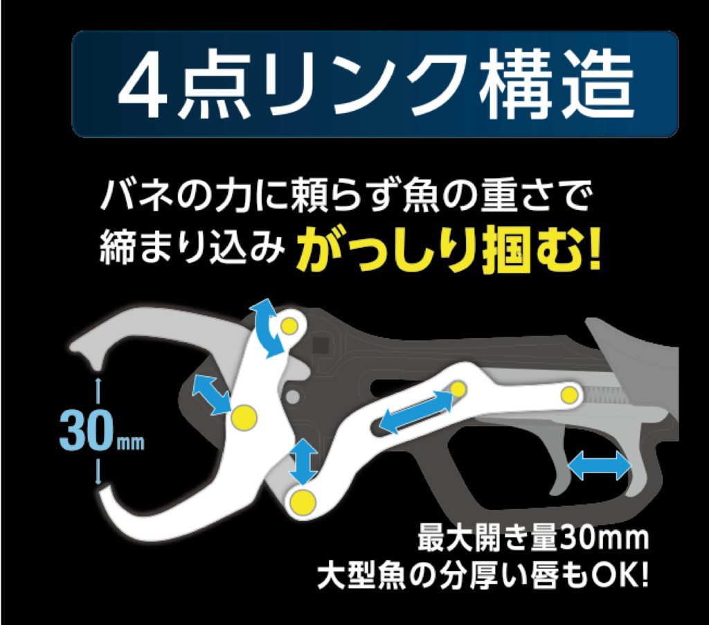 しっかり挟み込める構造もそうですが、大型魚に対応するためにアーム部分の開く幅もしっかり確保しています。
