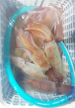 小浜沖の夜釣りのマイカは、胴長25~40cmのメタボサイズで上がっており、よい人は20パイオーバー。平均10パイ前後上げており、ボリューム満点の土産になっています。