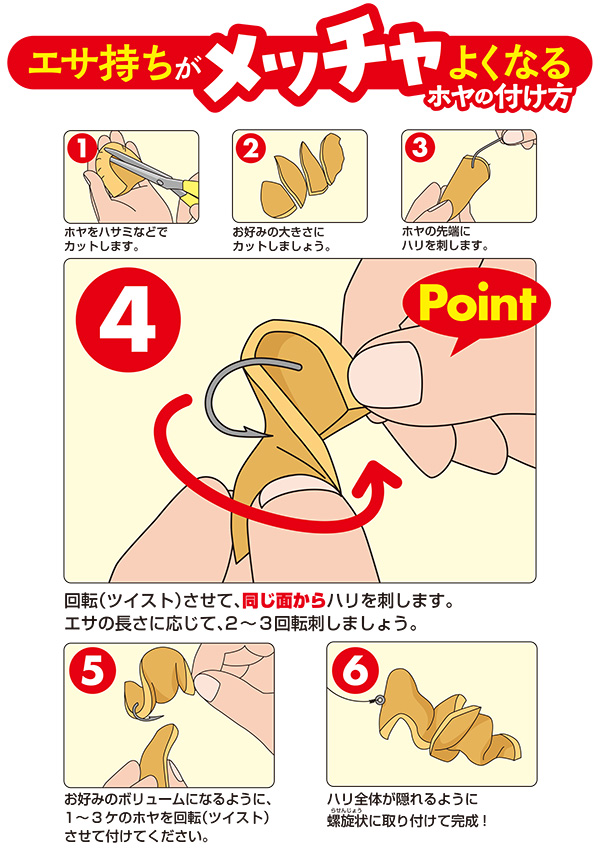 そのエサ付けの方法とは、「同じ面にツイストさせながら刺していくこと」。