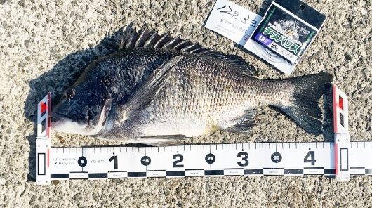 少し足場は悪いですが、テトラの上から竿2~3本前付近を狙って、ウキを流してください。タナは3ヒロを中心に、潮カミから流します。