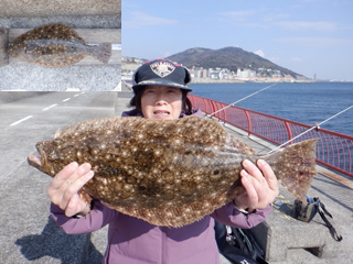 ヒラメ57cm2尾、チヌ41cm頭に2尾、サヨリ2尾、ウマヅラハギ35cm頭に3尾、カンダイ40cm、メバル25cm頭に7尾、小アジなど。