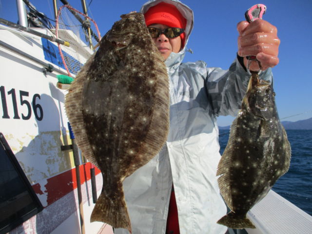 生きエサのヒラメ&根魚狙いは、ヒラメが60cm前後を頭に1船5尾ほど上がっており、エサの確保ができれば、もうしばらくは楽しめそうです。これに、アコウ25~40cm、ガシラ20~30cmなどの根魚がまじって土産になります。