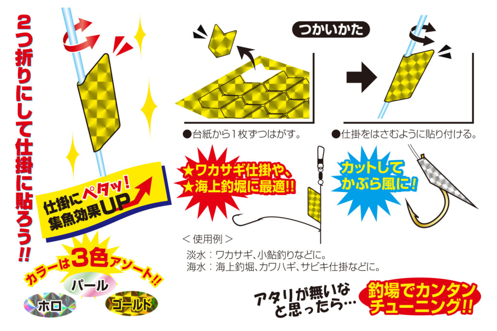 使い方は、ハリや仕かけ糸に挟みこむように貼るだけ!