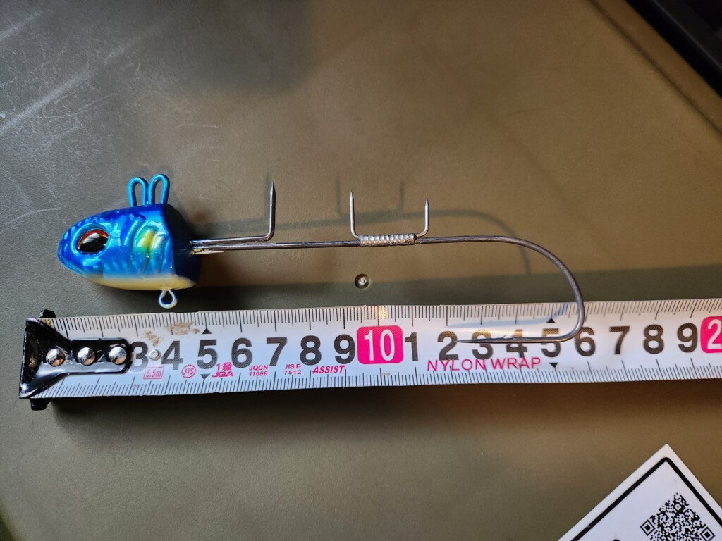 自宅にあるテンヤで1番大きいので、だいたい15~16cmほど。