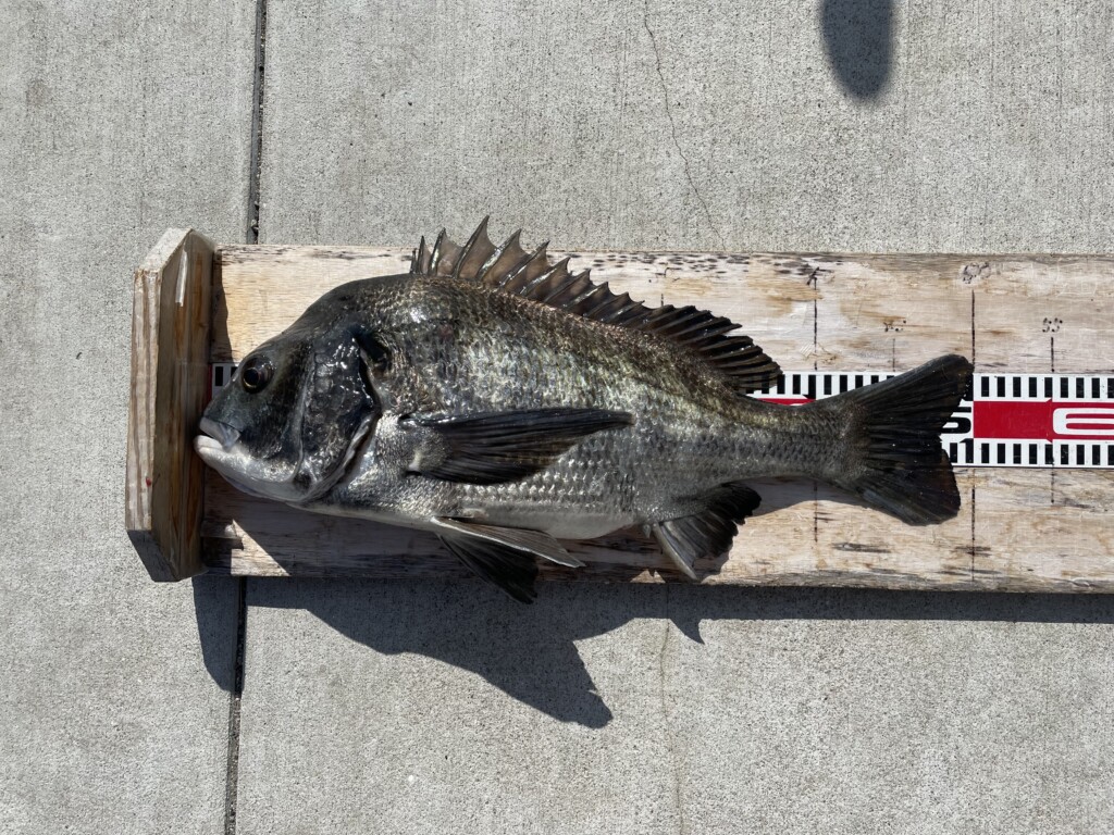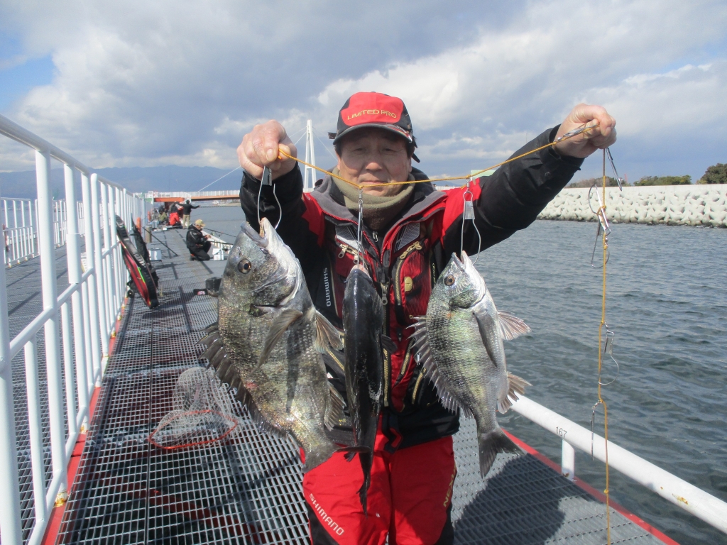 スズキ64cm、ハネ42~52cm6尾、チヌ30~43cm11尾、ウミタナゴ24cm。