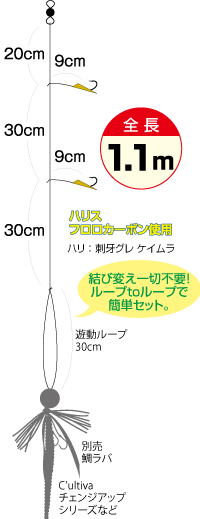 装着も簡単で、道糸側はサルカン、タイラバ側は遊動ループがあり、ループtoループで接続OK。