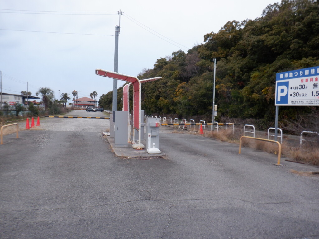 南港魚つり園護岸は、以前は駐車場を出てそのまま直進して釣り場へ入ったが、現在は工事の関係で、駐車場を出て、左前方の通路から入る。