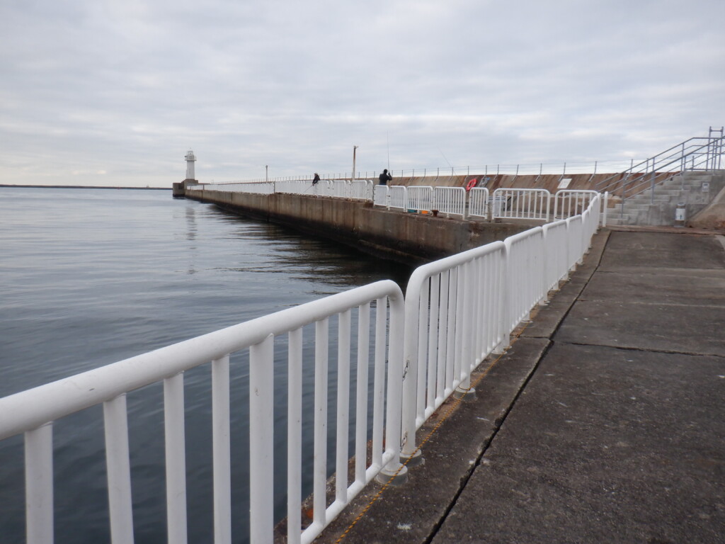 波止は東西に伸びていて、後方が高いので、冬の季節風は防げる。当日は風が弱い釣り日和で、ルアーマンが2人、青物を狙っている。