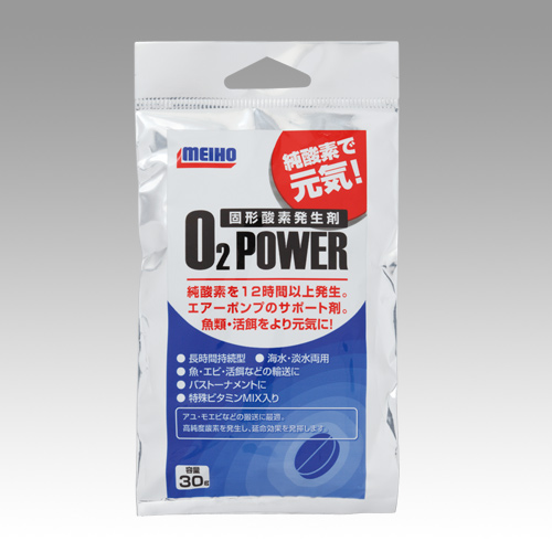明邦化学工業の「O2パワー(固形酸素)」は、入れておくだけで、アジやシラサエビなどの活きエサを長く元気に活かしておける、エアーポンプのサポート剤です。
