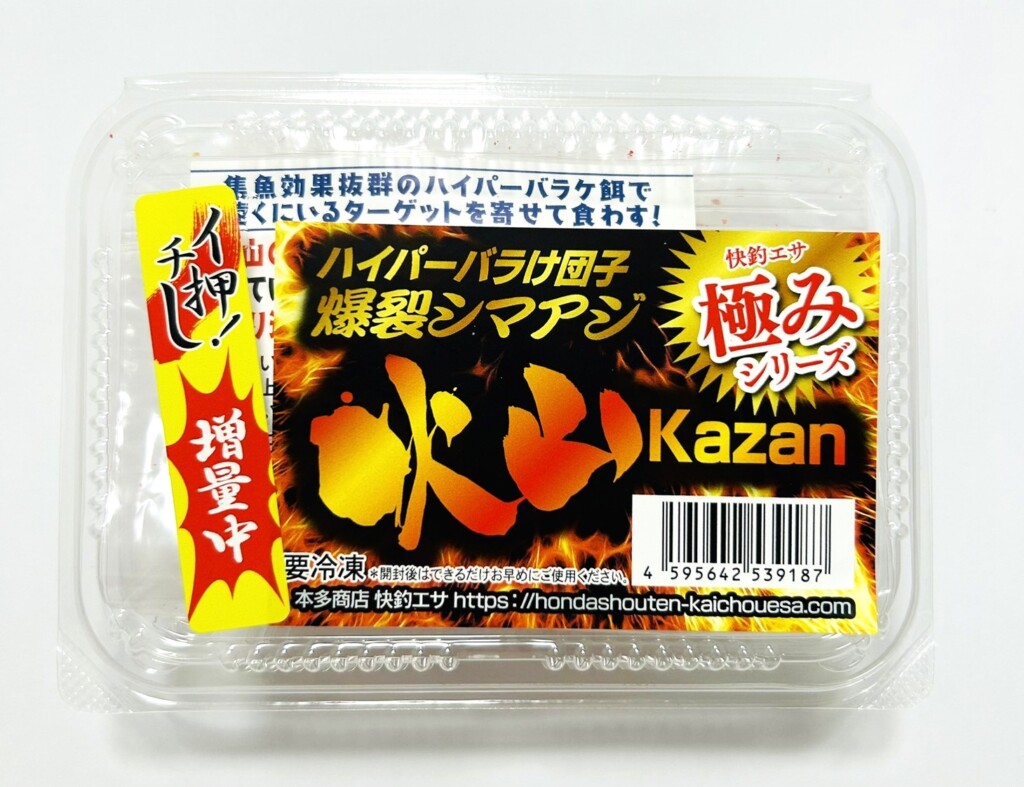 バラケに特化したというこの「火山」は、集魚効果に優れ、メインターゲットはシマアジ。ほかにもマダイやイサギ、カンパチにブリなどが狙える万能タイプのエサになっています。