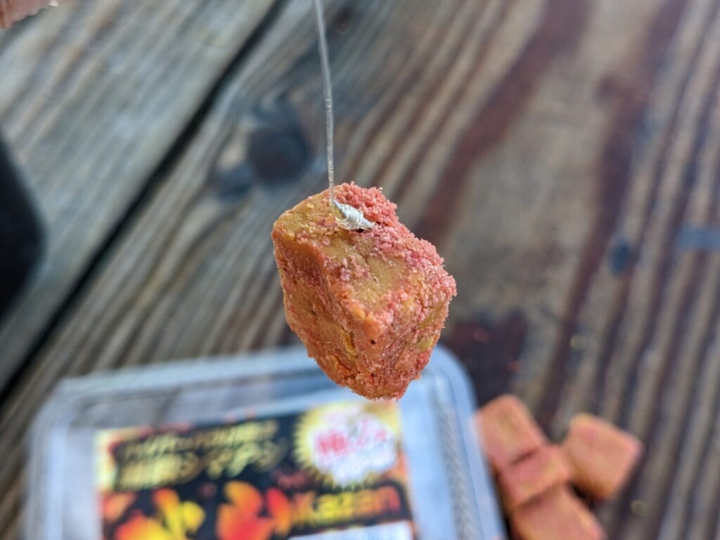 使い方は、ほかのダンゴエサと同じ。1粒付けや2粒付けで使用可能。この時の練り込みの強さを加減し、エサ持ちの調節をします。浮いている場合や底に沈んでいる場合、エサ取りを搔いくぐらなければならない場合など、状況に合わせ使用します。