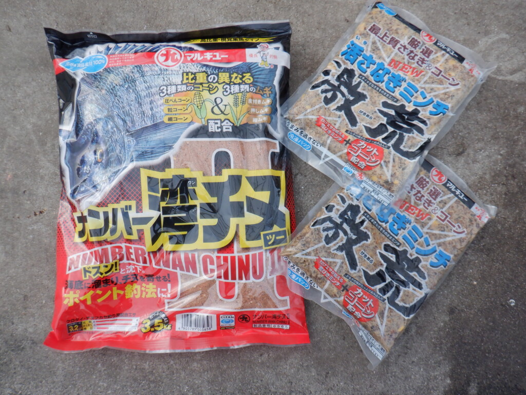 マキエはオキアミ3kg、ナンバー湾チヌⅡを2袋、ニュー活さなぎミンチ激荒2袋。サシエはくわせオキアミ食い込みイエローと、くわせオキアミスペシャル。
