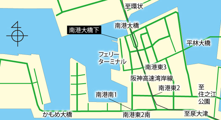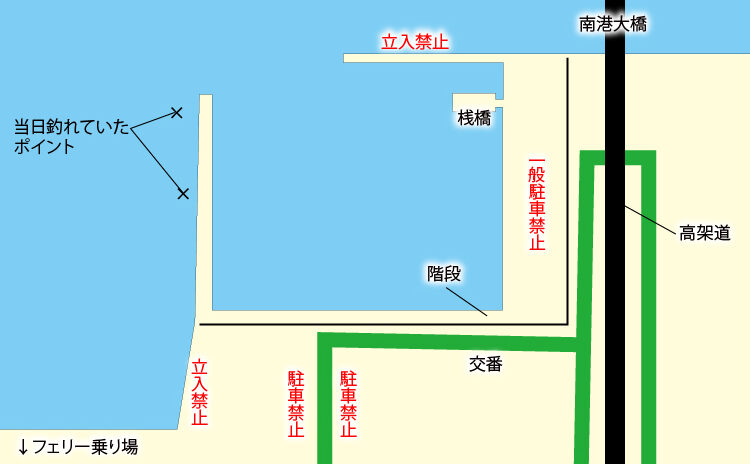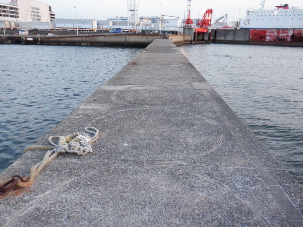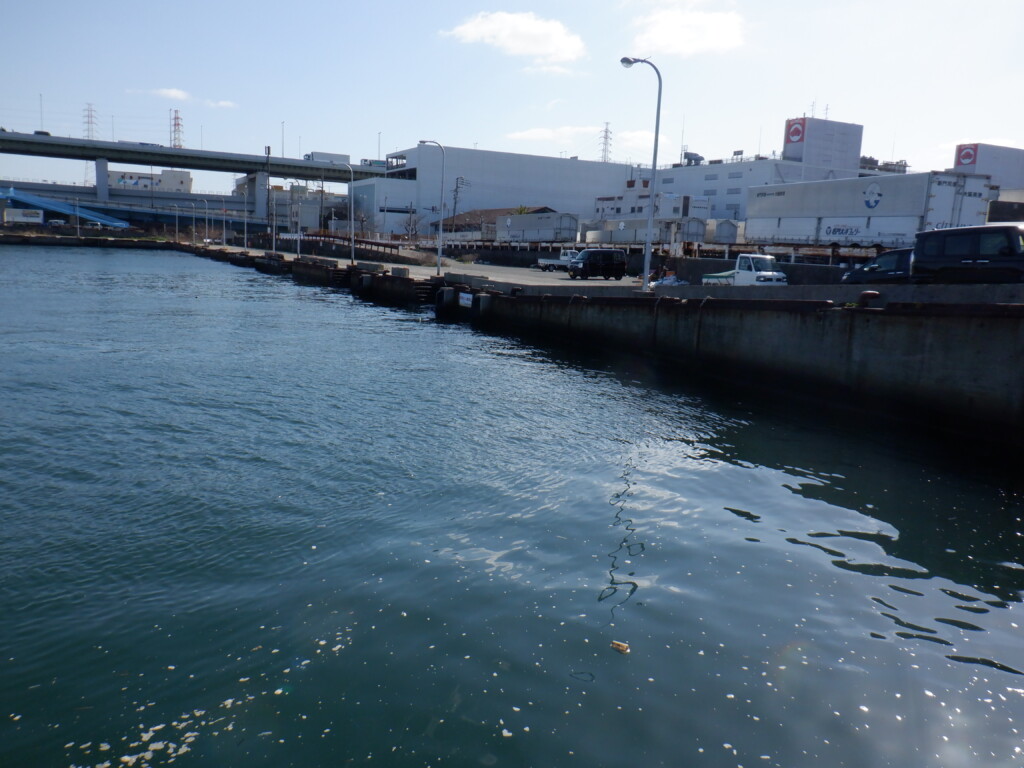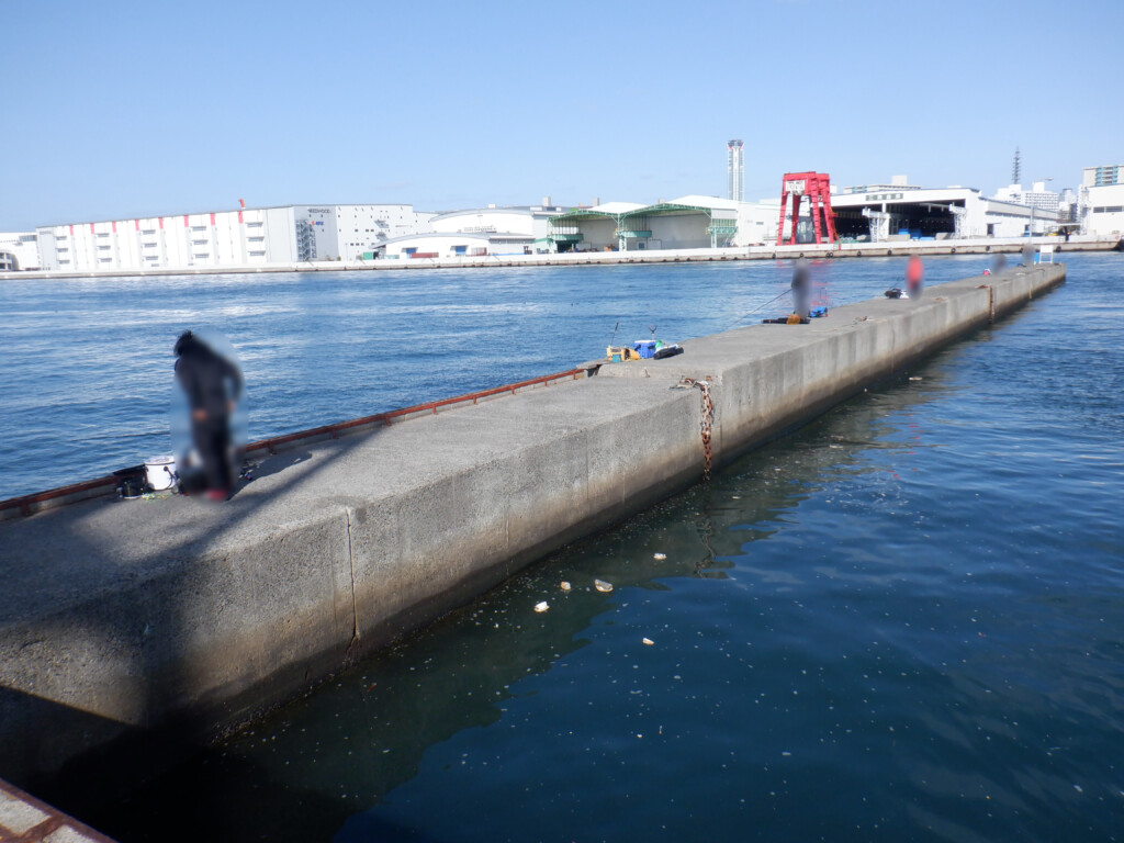 ここは南港大橋下の西側にあたる、小さな港を囲う西側の波止。長さは100m前後だが、水面までは3mほどなので、釣りはしやすい。