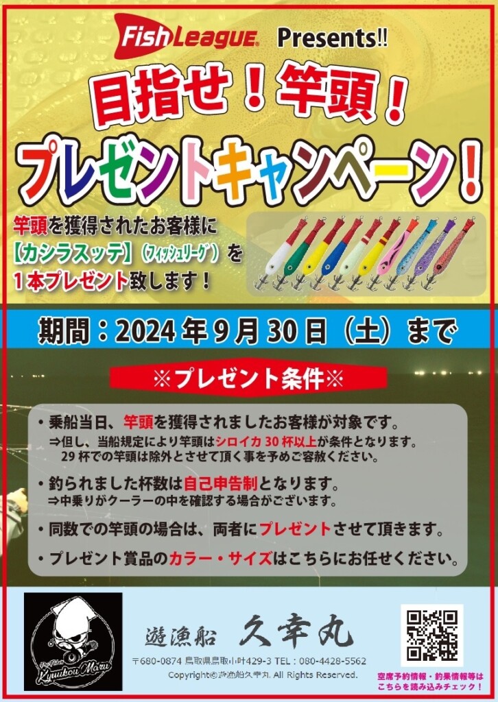 すでに釣行予定を立てて予約を入れている方も多いと思いますが、そのケンサキイカ釣りを楽しんで、結果その日の竿頭になれば、ご当地での釣果実績が抜群の人気スッテ、フィッシュリーグの「カシラスッテ」がもらえるキャンペーンが、鳥取県賀露港の久幸丸で今年も開催されます。