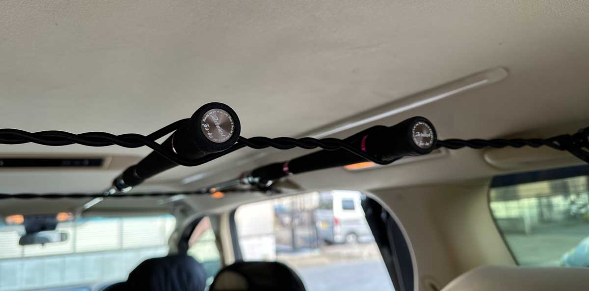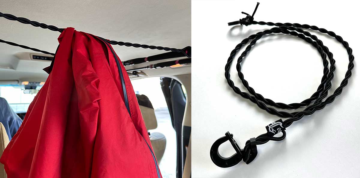 車内のアシストグリップ間を渡して 簡易のロッドホルダー・ウェアホルダーとして使いやすく作られています。