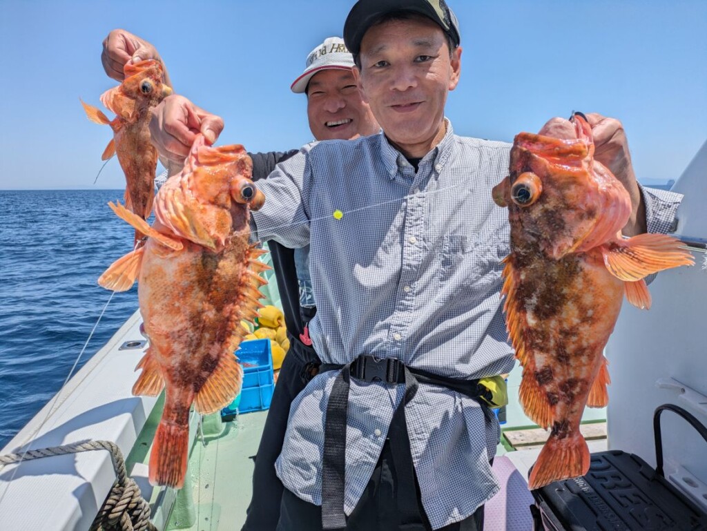 オニカサゴ狙いは、25~45cm級が船中30尾オーバー。ガシラも40cm前後の大型がまじって数上がり、土産は十分です。