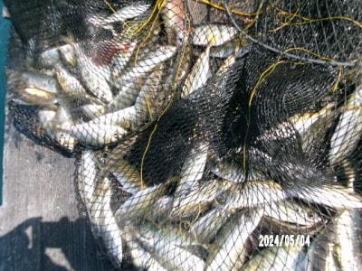 スズキ72cmと64cm、アジ16~25cm150尾、カタクチイワシ10~15cm6500尾、サッパ11~14cm30尾、ハゼ19cm。