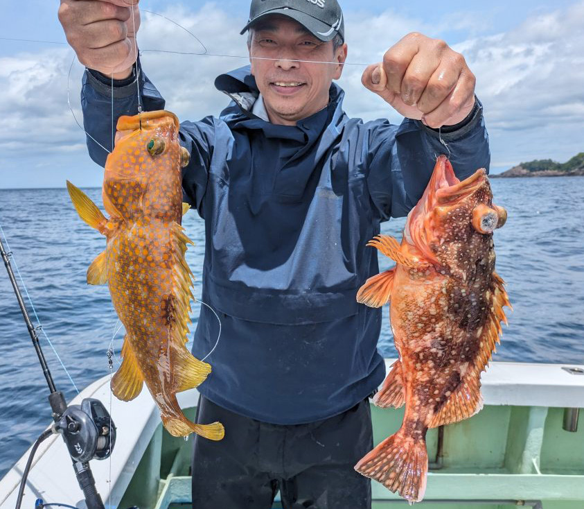 今週は船釣りでは、根魚の食いが抜群です。生きエサでのノマセ釣りでアコウ、天ビン仕かけの切り身エサでのオニカサゴ、どちらもよい人は2ケタ釣果が続出しており狙い目です。