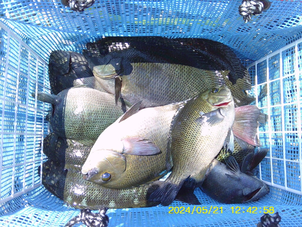 チヌ50.5cm頭に17尾、グレ30cm頭に4尾、スズキ70cm、ハマチ40cm、小ダイ11尾、ガシラ19cm頭に32尾、アジ20cm頭に50尾、豆アジ、カタクチイワシなど。
