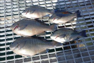 チヌ46cm頭に5尾、グレ25頭に3尾、ガシラ23.5cm頭に31尾、イワシ少々。