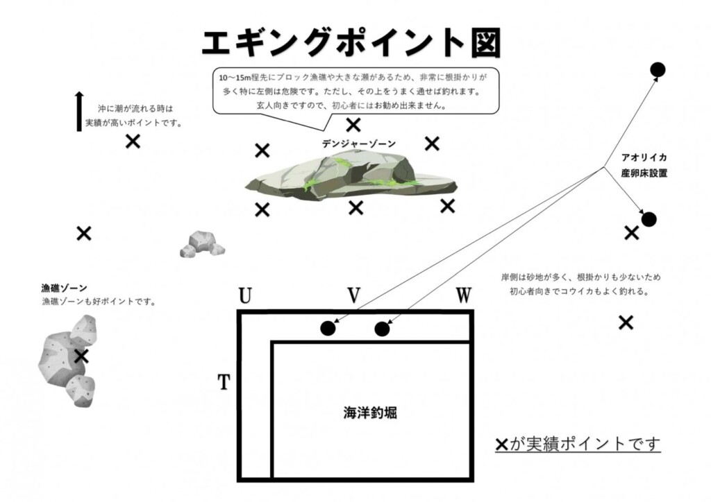 エギングでアオリイカを狙いたい方は、以下のポイント図を参考にしてください。