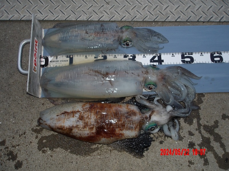 富田新港でアジ21cm頭に10尾、スズキ67cm、メバル18cm頭に3尾、アコウ42cm、チヌ42cm、コウイカ750g頭に2ハイ、シリヤケイカ300g頭に4ハイ、マダコ2kg頭に2ハイ。