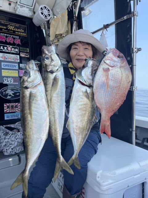 アジ狙いでは、40cmオーバーの大型がよい人2ケタ釣果。五目釣りではマダイやガシラ、サバなどもまじります。
