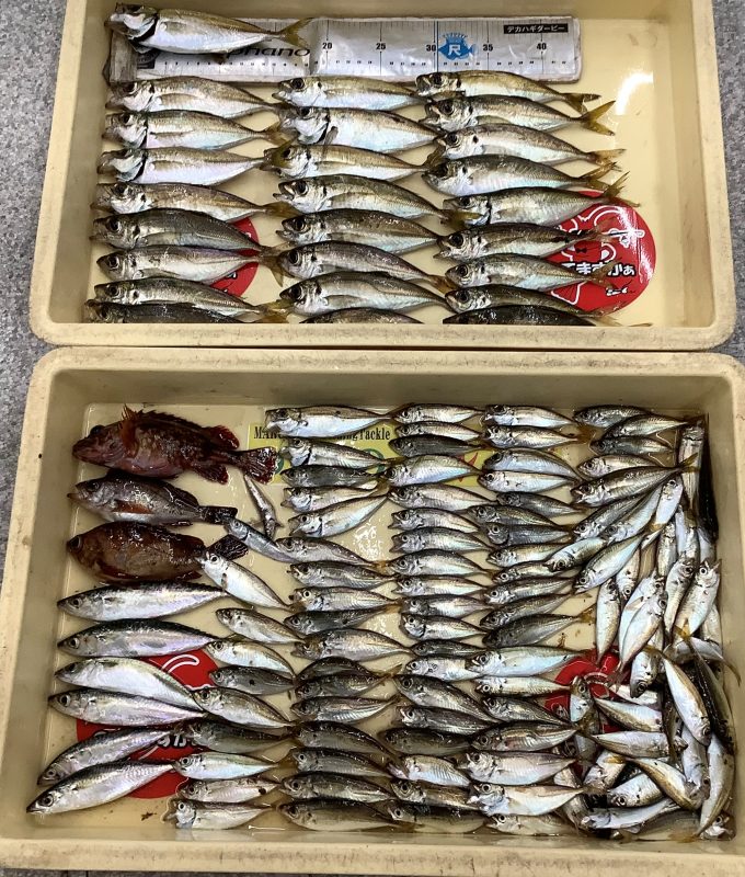 水軒のサビキ釣りでヤマモト氏アジ20cm級頭に多数と小サバ、カタクチイワシなど。
