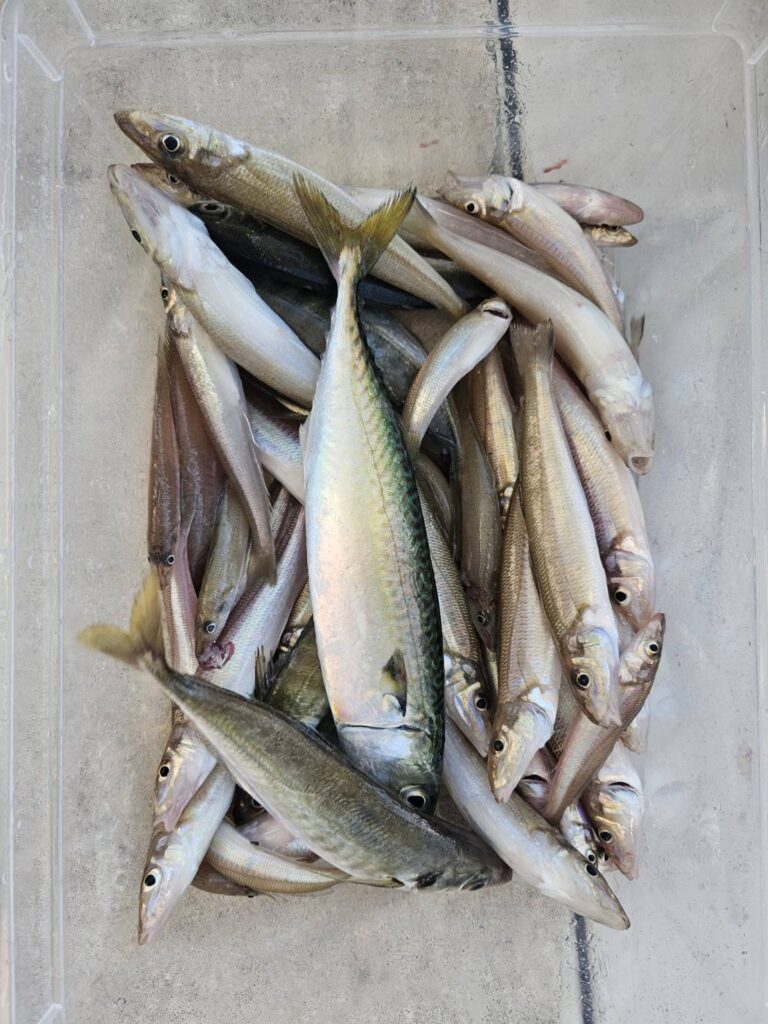 潮次第では、大型のアジも狙い目。40cm超を頭に、よい人5尾前後上げているほか、リレー便では60cm前後の超大型をまじえて型のよいクログチが期待できます。