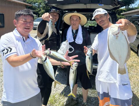 アジをメインとした五目狙いは、40cm前後を頭に25~30cm主体にアジはよい人2ケタOK。ほかにサバなどもまじります。落とし込みとのリレー便もあり、ヒラメやアコウなどの姿もありました。