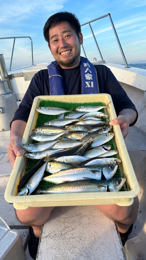 アジ狙いはショート便で26cm級頭によい人30尾前後、これにサバがまじる日もあります。