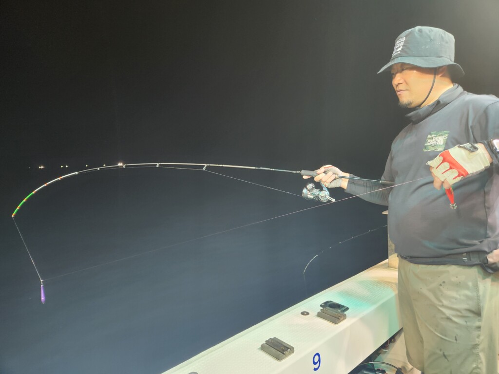 ステイも重要なので、船が揺れる場合は“放置”もありですが、基本的には誘いを入れた方がアピールになるので、電動リールのスローで巻き上げを掛けたり、竿を立ててスッテを動かしてやるのも有効です。