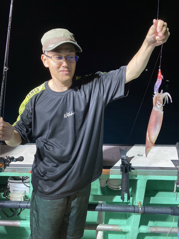 船釣りは、アジがやや小ぶりでしたが、25~30cm級主体に1人10~20尾OK。ほかにカイワリ20~25cm、サバ30~40cmなどが釣れて合わせてよい土産になっています。夜のマイカも、よい人2ケタの日もありました。
