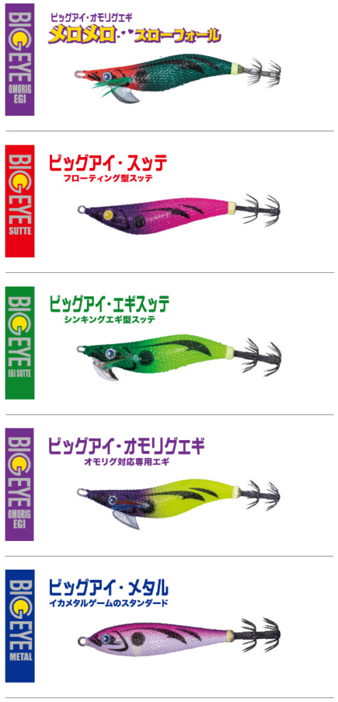 ラインナップとしては、ドロッパーは「ビッグアイ・スッテ」、「ビッグアイ・エギスッテ」。メタルスッテの「ビッグアイメタル」、オモリグエギには「ビッグアイ・オモリグエギ」に、2024年新たに仲間入りした「ビッグアイ・オモリグエギ メロメロスローフォール」と多彩!