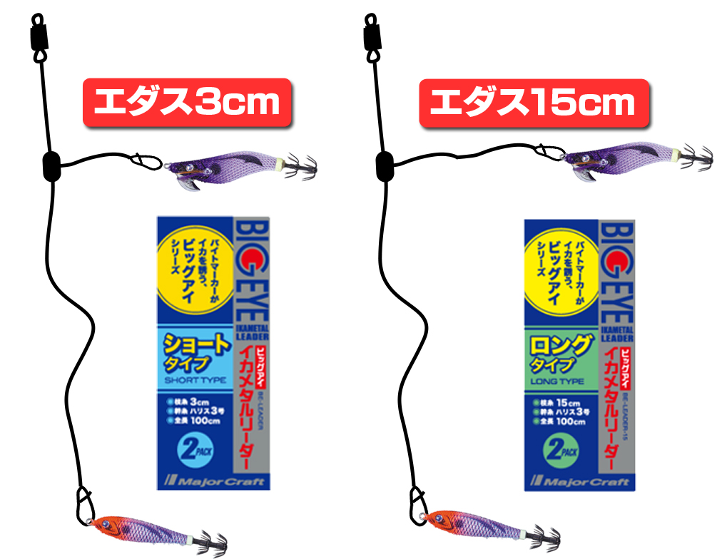 ヒロセマン「市販の仕掛けには、ショートタイプとロングタイプの2種類がラインナップされていることがほとんどです。メジャークラフトからも『ビッグアイ イカメタルリーダー』という仕掛けがあって、エダスの長さが3cmのショートタイプ、15cmのロングタイプがあります。