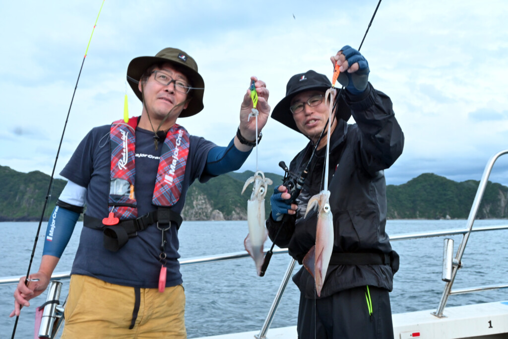 特に今年新しく発売になった『ビッグアイ・オモリグエギ メロメロスローフォール』は、1mを約11秒掛けて落ちる超スローフォール仕様なので超釣れます。イカがメロメロになっているのが分かりますね(笑)。」