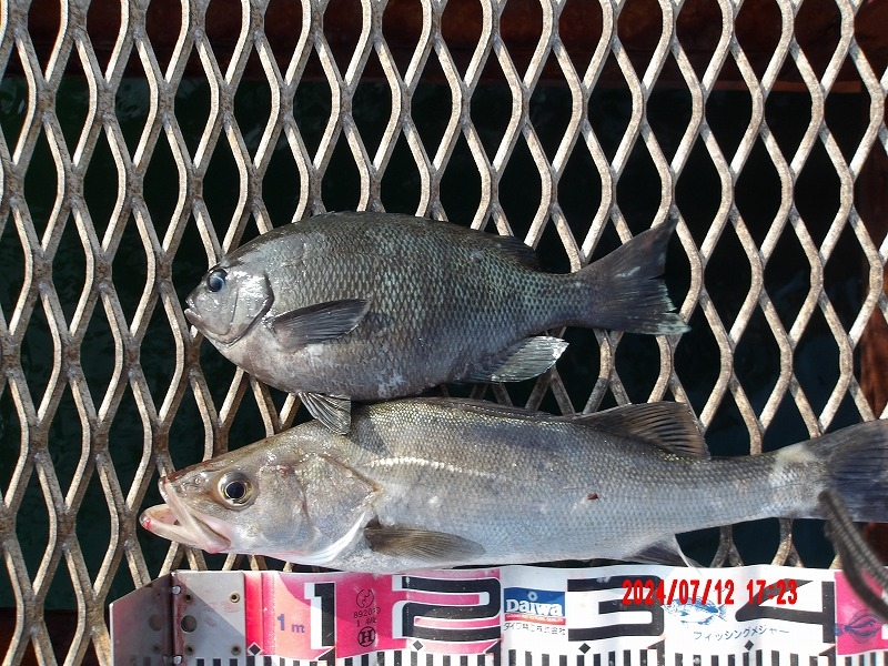 アジ20cm頭に6尾、サバ25cm頭に30尾、メジナ37cm、シーバス52cm。