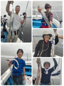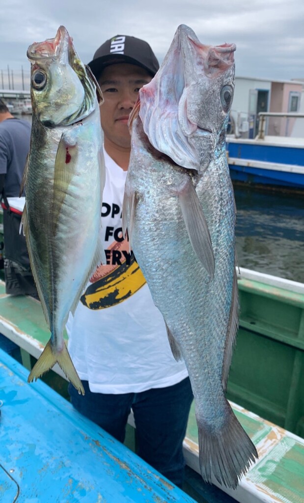 アジ狙いは、40cmオーバーの鬼アジクラスが連発中。小さくても尺前後で、10尾以上を上げる人もいました。リレー便ではクログチが60cm前後の特大クラスまじりで狙えます。