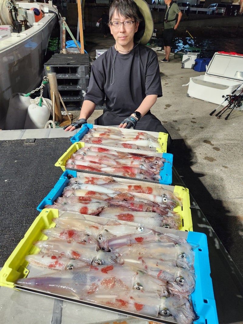 今週は、夜釣りのマイカが各沖ともに乗り好調で、ただ今イチオシのターゲットです。サイズはポイント、日によりムラがあるものの、コンスタントに1人2ケタ釣果が出ており、土産はOK。エリアによっては3ケタ釣果が出た日もありました。若狭湾の夏の風物詩が、これからしばらく楽しめそうです。