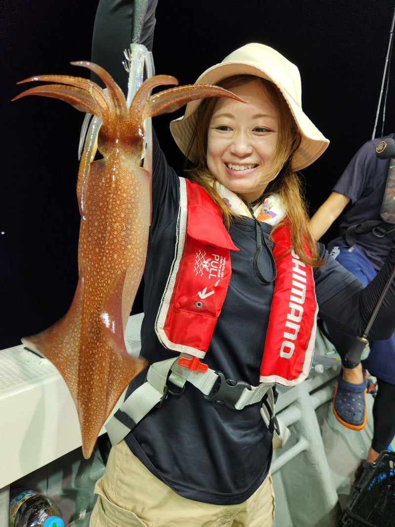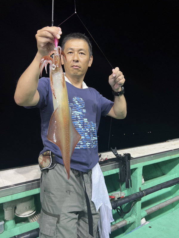 小浜沖では、半夜やオールナイトで狙うマイカがイチオシ。数は半夜便でよい人20パイ前後と連日安定しており、オールナイト便では60パイ上げた日もありました。型は胴長10~20cmの小型と、胴長30cmオーバーの良型が入り混じっており、良型がメインに上がればボリュームは満点です。