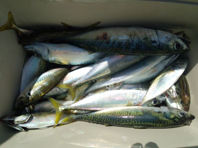 大島沖の夕方便、深夜便、オールナイト便などのマイカは乗りが渋い日もありましたが、よい日なら夕方便で59ハイ、オールナイトで46パイ上げた人もいました。バチコンやサビキでアジを狙えば、大型が10尾前後釣れています。