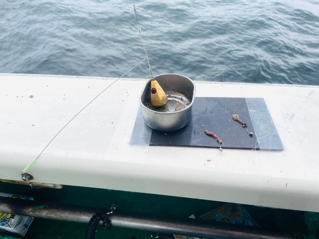 潮が速く、すぐにオモリが流されて仕かけが浮いてしまうタイミングには、針のチモトにガン玉を付け、誘った後のステイは長めがよかったです。