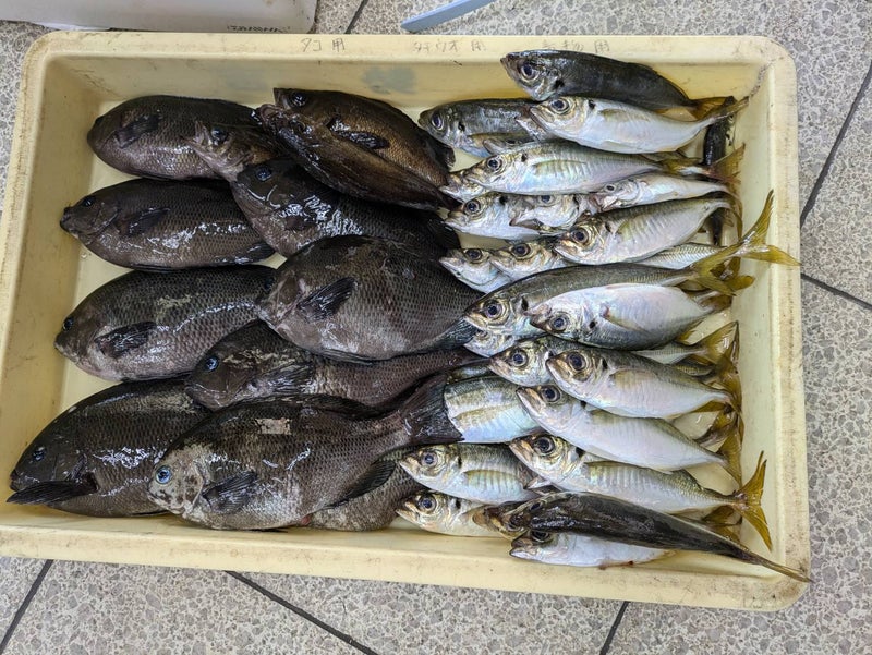 南港新波止でグレ27cm頭に9尾、メバル20cm頭に3尾、アジ22cm頭に35尾。別の日にはサバ40cm頭に4尾、サゴシ29cm、ツバス35cmなどが釣れていた。