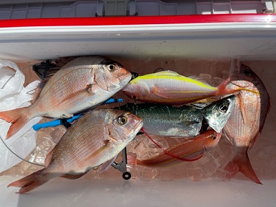 マダイ狙いのほかイワシエサを使えば、青物も狙うことができます。朝イチは青物狙い、10時頃からはマダイ狙いがオススメです。